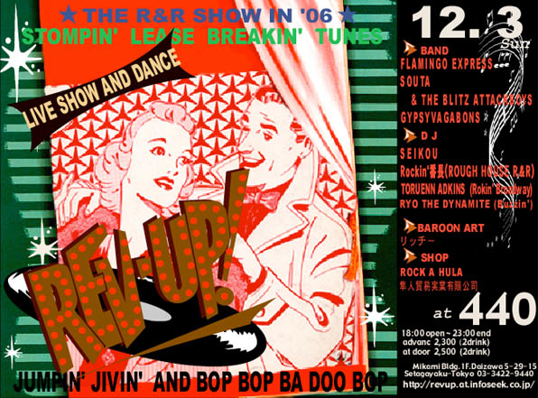 ◇◆「REV-UP! Vol.15」◇◆ 2006.12.3@下北沢440 ☆BAND FLAMINGO EXPRESS SOUTA & THE BLITZ ATTACK BOYS GYPSY VAGABONZ ☆DJ SEIKOU Rockin'番長(ROUGH HOUSE R&R) TORUENN ADKINS(ROCKIN' BROADWAY) RYO THE DYNAMITE(Buzzin') ☆BAROON ART リッチ− ☆SHOP ROCKA HULA 隼人貿易有限公司 ☆ADVANCE \2300(2Drink) ☆DOOR \2500(2Drink) ☆COME EARLY! 先着限定数 X’MAS セレクト CDプレゼント ☆18:00:OPEN〜23:00END