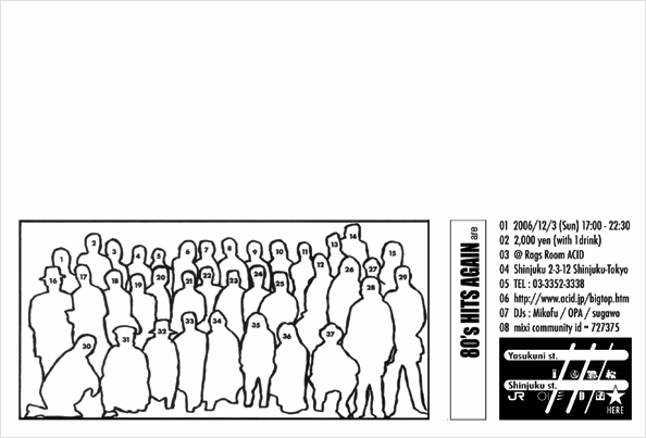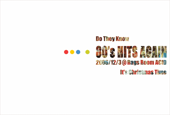 管理人様、 告知失礼致します。 _______________________________ 青臭くも煌めいてた「うれしはずかしな80年代」を 21世紀に蘇らせるべく始まったクラブ・イベント 『80's HITS AGAIN』。 80年代のビルボード・チャートを賑わした 「ダサカッコいい」ヒット・チューンを中心に、 30代の方々には悶絶&感涙の一夜を、 若い方々には温故知新を体感できる一夜を。 オールで遊ぶのが大変な人でも安心の デイタイム・クラブ・イベント 『80's HITS AGAIN』第3回目の開催です。
