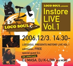 武蔵小杉駅前にオープンしたCLUB MUSICショップ「LOCOSOUL」は、DMC JAPANファイナリスト「DJ MASA」を迎えてのインストアイベントを開催します!! 国内トップクラスのバトルDJのプレイを生で見られるチャンスです、お見逃しなく!! 入場はもちろん無料です!! 2006 / 12 / 3 (SUN) 2:30 – 4:30 LOCOSOUL@武蔵小杉 presents INSTORE LIVE Vol.1 場所: LOCOSOUL 武蔵小杉駅より徒歩2分 アクセスhttp://www.locosoul.com/access.html DJ: MASA(DMC関東ブロック優勝DJ) K-LOW, TYPE-M ENTRANCE FREE!!!(入場無料) 当日、