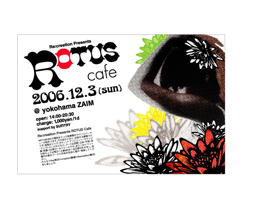 Re.creation Presents 『R』otusCafé 協賛:SUNTORY 日程:12月3日(日)PM14時00分〜PM20時30分 料金:1000円(1DRINK) またまた激安!! 場所:横浜創造界隈・ZAIM1Fホール http://za-im.jp/php/ 〒 神奈川県横浜市中区日本大通34 TEL 045-222-7030 【電車】みなとみらい線「日本大通り駅」徒歩2分JR根岸線・横浜市営地下鉄「関内駅」徒歩5分 【車】[品川方面・第3京浜から] 首都高速横羽線「横浜公園」ランプ降りてすぐ[首都高速湾岸線から] 狩場線「新山下」ランプより5分[東