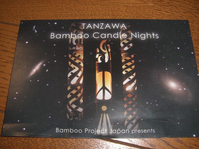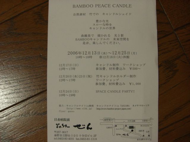 みなさん!^−^!初めまして Bamboo Project JapanのBamboo mamaと申します♪ 管理人sama告知をさせて下さい!! 0000000000000000000000000 TANZAWA Bamboo Candle Nights ●日程・場所 12月13日(水)〜12月25日(日) 12月18日(火)休館 【 ぎゃらりー ぜん 】 神奈川県秦野市立野台1−2−5【十全堂ビル 2F】 tel 0463−83−4031 fax 0463-81-1318 ●時間 10時〜18時 ◎1