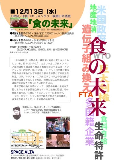 1本の映画が、米国の食・農政策に劇的な変化をもたらしている。初めは、04年3月、カルフォルニア州メンドシノ郡の遺伝子組み換え食品と家畜を禁止 る法律(メンドシノ法)の制定。翌4月には、バーモント州全体が遺伝子組み換え製品に対する登録と表示を必要とする州法を制定。以来、カリフォルニア州だけで10以上の自治体が同様の法律を作成してきたが、背景にはこの映画の上映運動が大きな力となったといわれている。 遺伝子組み換え作物によって、世界の食料と生物を支配しようとする多国籍企業とアメリカ政府。その暗部を追った、注目のド