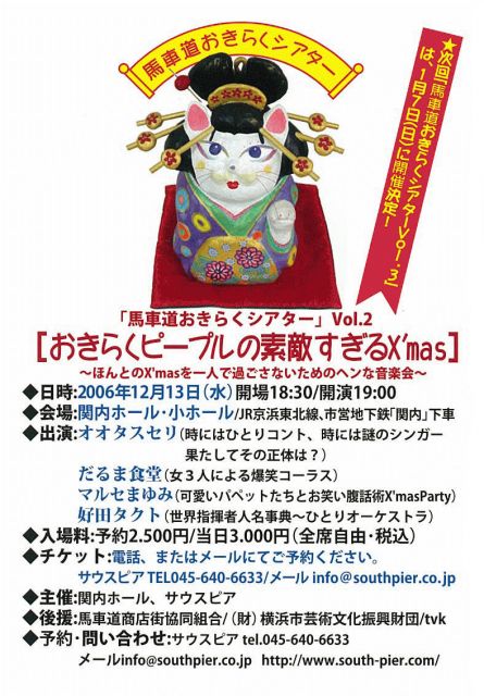 馬車道おきらくシアターVol.2 「おきらくピープルの素敵すぎるX'mas」 〜ほんとのX'masを一人で過ごさないためのヘンな音楽会〜 日時:2006年12月13日(水)18:30開場/19:00開演 会場:横浜関内ホール 小ホール 入場料:前売2,500円/当日3,000円(全席自由) 【出演者】 オオタスセリ だるま食堂 マルセまゆみ 好田タクト 予約・問い合わせ:サウスピア http://www.south-pier.com/ TEL:045-640-6633 MAIL:info@southpier.co.jp コミュもあります♪ 「馬車道おきらくシアター」 http://mixi.jp/view_commun