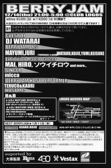 【DJ】 WATARAI MAYUMI JURI WATARU KOJIE YUMI KEISUKE 【EXHIBITION MATCH】 MC & REFEREE KAZU MAI(NUMERO UNO)×SHINICHI(BUTTER) コロ一ル×SHINYA(DOUBLE TROUBlE) Hiro(ALMA)×ソウイチロウ TAISHOW(ZENITH)×CROSS(CR∀FT)