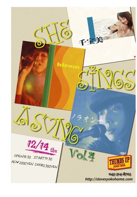 ☆12月14日(木) 「She Sings A Song Vol.4 」 会場 横浜ThumbsUp(サムズアップ) 出演 hiro:nhttp://www.hironline.com//ノラオンナ/千宝美 http://www.chihomi.info/index.php OPEN18:30/START19:30 ADV¥2000/DOOR¥2300 http://www.terra.dti.ne.jp/~stoves/tup/ *今年2月に始まったソウルシンガーhiro:nとThumbsUpがお届けする女性シンガーのショーケース"She Sings A Song"もとうとう4回目。ほぼ3ヶ月に一度という快調なペースで様々なタイプのアーティストをお招きしてまいりました。今回の出演はウ