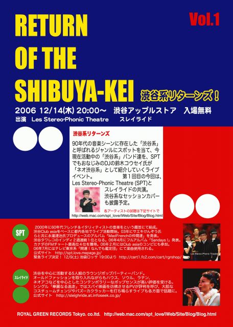 Apple Store Shibuyaコミュのみなサマこんにちは。 東京・大阪・名古屋でおなじみの60’Sキューティグループ 「ステレオフォニック・シアター」(SPT)の鈴木コウセイです。 今現在活躍中の「渋谷系バンド」を、SPTのボクが次々に紹介していこうというイベントの第1回目を12/14に渋谷のアップルストアで開催いたします。その名も「渋谷系リターンズ」。 入場無料ですので、お時間ある方はぜひ。 ●12月14日(木) 渋谷アップルストア インストアイベント 20:00〜21:00 「渋谷系リターンズVol.1」入場無料ライブ 第1回目の共