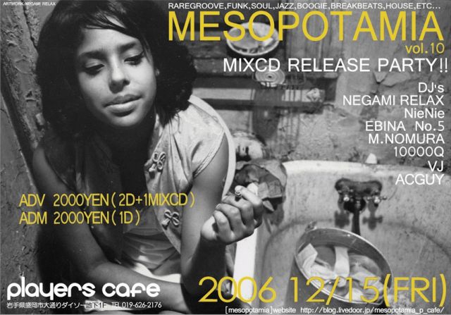 いよいよ今週末12/15(金)にせまった、今年最後のメソポタミア! 今回のメソポタミアは、レギュラーオンリーでのお祭り騒ぎ。 レギュラー全員が一気にMIXCDをリリース! 誰のMIXCDがアナタはお好みですか? じっくりCDを選び終わったら、後はフロアにて生でその音を体験! 夜の街でメソポタミア!そして家に帰ってもメソポタミア! アナタの為のメソポタミアでございます!!! ▲▲▲ 2006 12/15(FRI) [MESOPOTAMIA vol.10] MIXCD RELEASE PARTY!! DJ's NEGAMI RELAX NieNie EBINA No.5 M.NOMURA 10000Q VJ ACGUY(H