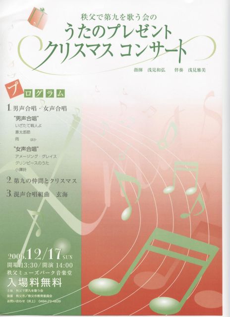 初めまして! 「秩父で第九を歌う会」と申します。 市民による「第九」をきっかけに有志が集い、昨年から一般の合唱団として活動を始めました。 現在は、邦人作品を中心に、様々な曲に挑戦しています。 今年3月には、第1回目の演奏会を開くことが出来ました。 今回は、第2回目の演奏会となります 「クリスマスコンサート」 のご案内をさせて頂きます。 秩父で第九を歌う会 「うたのプレゼント クリスマスコンサート」 日時 2006年12月17日(日)13:30開場 14:00開演 場所 秩父ミューズパーク音楽堂 交通