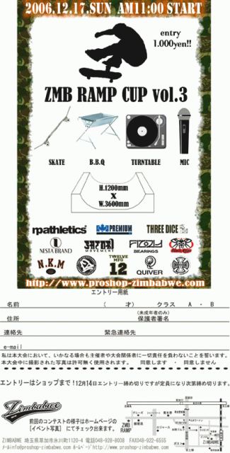 スケートボードミニミニランプコンテスト開催! 「ZMB RAMP CUP vol.3」 エントリーされる方は早めにお店まで! MAIL / info@proshop-zimbabwe.com TEL / 048-928-8008 エントリー者はAM9:00集合 大会スタートAM11:00. BBQ、ターンテーブル、MIC、DVD上映などなど、 見に来るだけの方も楽しめます! http://www.proshop-zimbabwe.com 前回の模様 http://plaza.rakuten.co.jp/zimbabwe/diary/200607280000/