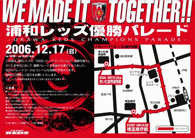 1.日時:2006年12月17日(日)10:00〜10:45(予定) 2.主催:浦和レッズ優勝パレード実行委員会 3.予定コース:埼玉県庁→県庁通り→旧中山道→オフィシャルショップ・レッドボルテージ→市役所通り→さいたま市役所(別紙チラシ参照) 4.その他:コース、時間等は状況に応じて変更されることもあります http://www.urawa-reds.co.jp/tools/page_store/nimages/news_2861.pdf