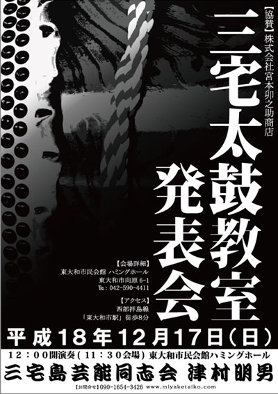 三宅太鼓教室の発表会のお知らせです! 詳細は下記になります↓ ■日時:12月17日(日) ■12:00〜(会場11:30) ■場所:東大和市民会館ハミングホール ■会場tel:042-590-4411 ■会場HP:http://www.city.higashiyamato.lg.jp/14,0,50.html アクセス: ▼JR「立川駅」北口から 東村山駅・ダイヤモンドシティ行バス(8番)、 ▼芝中団地・南街行バス(6番)「南街入口」下車徒歩2分 ▼西武拝島線「東大和市駅」から徒歩8分 ▼多摩都市モノレール「上北台駅」から ちょこバスでハミングホール下車 津村