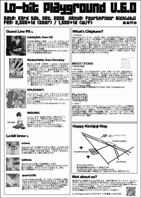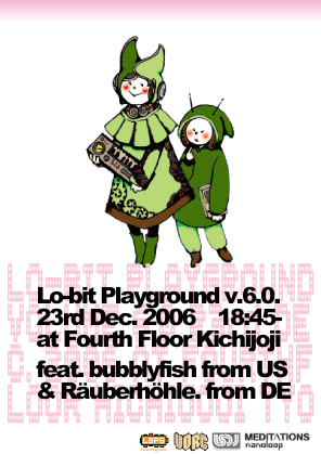 Lo-bit Playground Volume 6.0 2006年12月23日(土)土曜日で、しかも休日だ! 開場:18:30/はじまり:18:45/おわり:22:00 場所:吉祥寺FOURTH FLOOR(http://fourthfloor.sub.jp/ ) 料金:¥1,500 w/1drink(フライヤ・当トピにて参加表明) :¥2,000 w/1drink(当日) ☆GUEST LIVE PA Bubblyfish(http://www.bubblyfish.com)FROM アメリカ R?uberh?hle(http://www.megapeng.net/)FROM ドイツ KPLECRAFT(http://kplecraft.com/) MIGMO(http://www.cctron.com/migumo/) ☆The Lo-bit Classics Deluxe saitone(ht