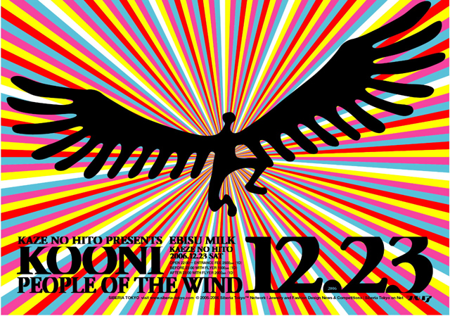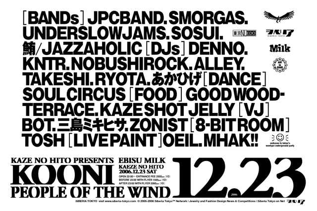 やってきます! 今年最後のKOONIが!! もう風の人オールスターって感じの出演陣になっております 今年最後楽しんでいきましょ そんで、来年も楽しいものに!! kazenohito presents KOONI 2006.12.23(sat) [ENTRANCE FEE] OPEN 22:00〜 →2,500yen(1D) BEFORE 23:00 with FLYER →1,500yen(1D) AFTER 23:00 with FLYER →2,000yen(1D) [BANDs] JPCBAND SMORGAS UNDERSLOWJAMS SOSUI 鮪/JAZZHOLIC [DJs] DENNO KNTR NOBUSHIROCK ALLEY TAKESHI RYOTA あかひげ [DANCE] SOUL CIRCUS [FOOD] GOODWOODTERRACE KA