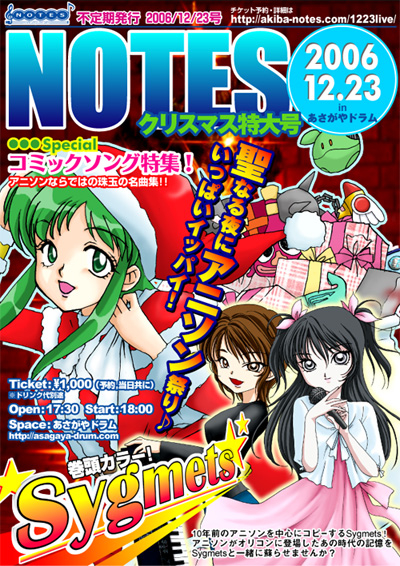 アニソンバンドNOTESと、Sygmetsさんでお贈りする 古いアニソンから新しいアニソンまで!なライブです。 NOTESは「コミックソング特集」でお届けデス。 なかなか他のバンドさんではやらない様な曲をお届けしますー。 クリスマスイブイブという微妙な日程ではございますが 宜しければ皆さんお誘いあわせの上、お越しくださいませ^^ 詳細、チケットの予約はこちらから。 http://akiba-notes.com/1223live/ チケット: 前売・当日:1,000円(ドリンク500円〜) 出演: Sygmets http://live.s137.xrea.com/sygmets/ NOTE