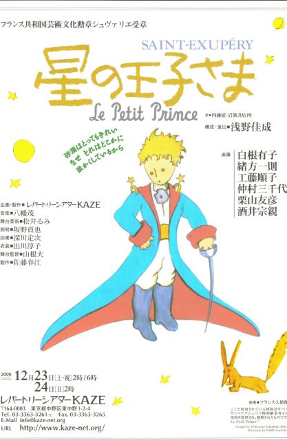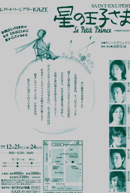 劇団 風 クリスマスに、 『星の王子さま』上演! 2006年12月23日、24日東中野レパートリーシアターKAZEで公演します。 タイムテーブル 開演 23日 14時・18時 24日 14時 場所 レパートリーシアターKAZE 東京都中野区東中野1−2−4 総武線東中野駅東口下車右手へ裁判所通を直進。 大久保通を左折、100m先左側。 中野坂上駅(営団地下鉄丸の内線/都営地下鉄大江戸線)A1 出口からは徒歩7分。 入場料 当日 4000円 前売り 3800円 学生 3300円 劇団員割引 3500円