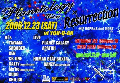 2006/12/23(sat)@You-Q-An START 22:00 FINISH 05:00 ENTRANCE FEE \1500/1drink WITH FLYER \1000/1drink Genre: HIPHOP,R&B etc... DJs: TAYAMA (PLANETOLOGY) SADOBEN (PLANETOLOGY) KEN (PLANETOLOGY) CK-ONE (PLANETOLOGY) SHU-GO (PLANETOLOGY) Kazzy (Resurrection) Ma'ko (Resurrection) MC: PLANET GALAXY (PLANETOLOGY) Human Beat Boxer: Ganzy (Resurrection) 2006年も残りわずか… 今月もやってきました、PLANETOLOGY Vol.11♪ 今年最後のPLANETOLOGYはクリスマススペシャルと言うことで、岩手
