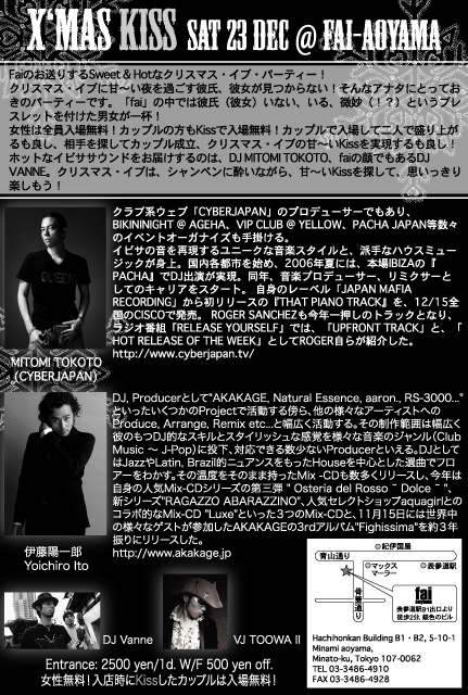 伊藤陽一郎 (AKAKAGE)さん出演決定!fai青山のクリスマスパーティーです!女性は全員入場無料+0:00までに入店すれば、シャンパン1杯プレゼント!