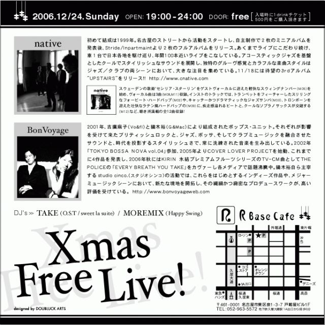 Xmas Free Live!!!!! open19:00〜24:00 入場無料!! Live native Bon Voyage DJ's TAKE (O.S.T/sweet la suite) MOREMIX (Happy Swing) native 結成は1999年。名古屋のストリートから活動をスタートし、自主制作で2枚のミニアルバムを発表後、Stride/Inpartmaintより2枚のフルアルバムをリリース。あくまでライブにこだわり続け、車1台で日本各地を駆け巡り、年間100本近いライブをこなしている。アコースティックジャズを基盤としたクールでスタイリッシュなサウンド を展開し、独特のグルーヴ感覚とカラフルな楽曲スタイルは