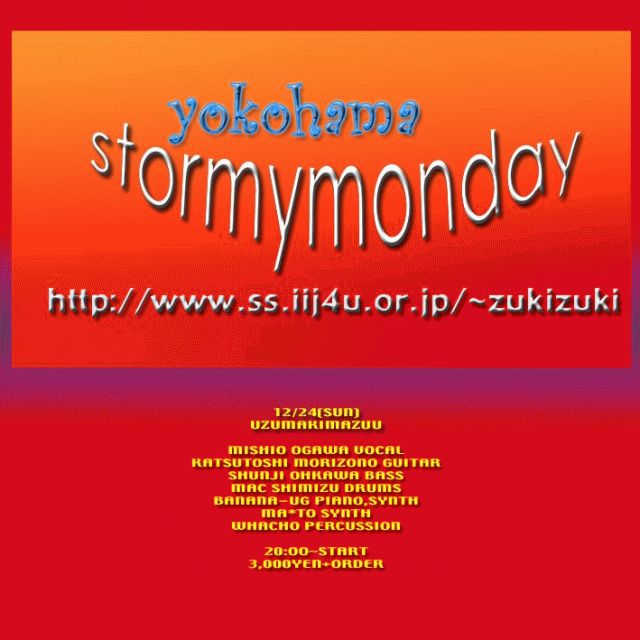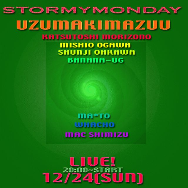 ウズマキマズウ ゲスト 森園勝敏guitar クレクレタコラ 小川美潮vocal 大川俊司bass banana-UG key ma*to synth whacho percussion mac 清水percussion.drums http://www.ss.iij4u.or.jp/~zukizuki/ さてみなさん、師走で忙しくなってきました。 もう、めっきり冬ですね。 イヴの日にストーミーでライブです。 森園さんをまた迎えてのパーティーです。 イヴの夜は美潮の歌とともに過ごしましょう! おまちしております!!!
