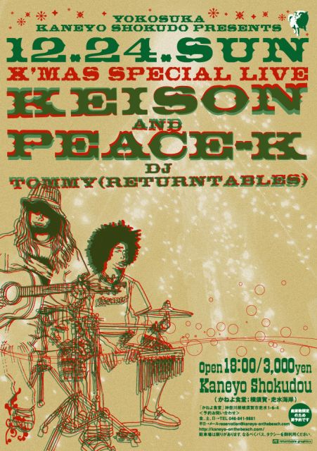12/24(日)横須賀かねよ食堂 http://www.kaneyo-onthebeach.com/ http://mixi.jp/view_community.pl?id=165227 Keison & Peace-K Christmas Live! [ Live ] Keison & Peace-K http://www.terra.dti.ne.jp/~stoves/keison/ http://www.k5.dion.ne.jp/~peace-k/top.html [ DJ ] Tommy (returntables) OPEN 18:00 / START 19:00 ENTRANCE ¥3,000 「かねよ食堂」 神奈川県横須賀市走水1-6-4 <予約お問い合わせ> 18時〜24時 水、木、金、土、日→TEL 046-841-9881 平日→メール reservation@kaneyo