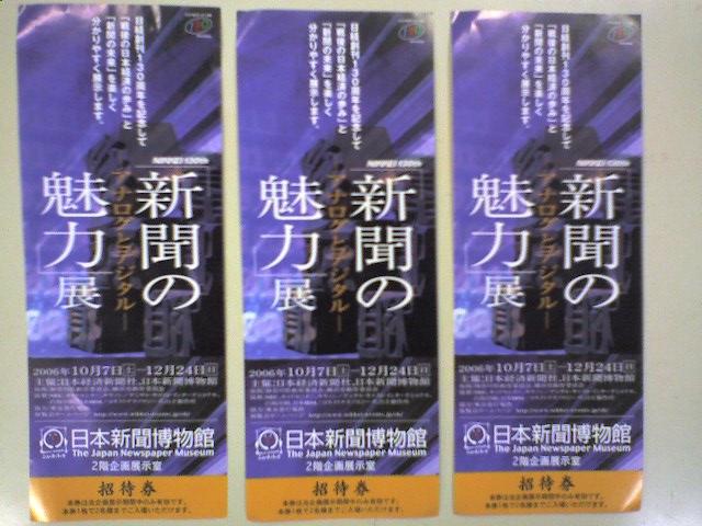 横浜にある、日本新聞博物館の 特別展「新聞の魅力-アナログとデジタル-」 http://www.pressnet.or.jp/newspark/ の招待券が6名分(ペア券3枚)があります。 今週末、12/24(日)までです。 (最寄りはみなとみらい線日本大通り駅) 上京の際行こうと思って買ったのですが、届いたのが 行き違いで自分は結局使えませんでした…orz 送料はご負担ください。 (折ってよければ最安でミニレター\60です) 今までお世話になった方優先に差し上げますが、 あとは先着順です。 コメントでお願いいたします。 私の代わりに、どう