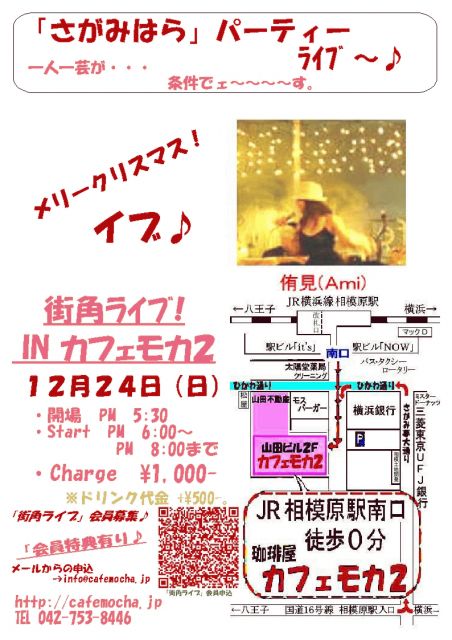 今月も・・・・・・ パーティ ライブ!! クリスマス イブ♪ 出演:・Ami 一人一芸が条件です〜。 まあまあ見るだけでも大歓迎です!!(^0^) ・・・ (侑見(Ami)) Ami http://mixi.jp/show_friend.pl?id=1501905 Charge \1,000- ※ドリンク代は別途必要となります。
