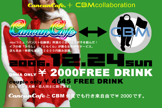 姉妹店でも提携店でもない同業者が手を組んだ! 「ひろし」と「ともくん」2店の包茎店主からのプレゼント。 「CBM」と80mほど離れたバー「カンクーンカフェ」が贈る業界初オダサガ革命! 12月24日午後7時〜閉店までのあいだ、 女性に限り¥2000(込)で飲み放題!(時間無制限) さらにその料金で「CBM」「カンクーンカフェ」の 行き来が自由!(何往復してもOK!) (当日、共通パスを渡します) CBMでマスターの会話に飽きたら カンクーンでダーツなど、 カンクーンに飽きたらCBMへ、 個人での移動、仲間同士の移動