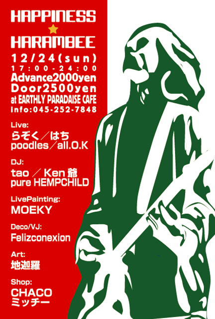 暖かく幻想的な空間でHAPPYに! 最高なグル〜ヴでHAPPYに! 個性豊かなアートでHAPPYに! キュートなアクセサリーでHAPPYに! 美味しいお酒&フードでHAPPYに! みんなの素敵な笑顔でHAPPYに! そしてカテンベにあなたのHAPPYを少しだけ分けてあげてください。 http://mixi.jp/view_community.pl?id=697352 『HAPPINESS*HARAMBEE』 @ Earthly Paradise Cafe 桃源郷 ◇LIVE はち http://mixi.jp/view_community.pl?id=99572 らぞく http://mixi.jp/view_community.pl?id=28753 po