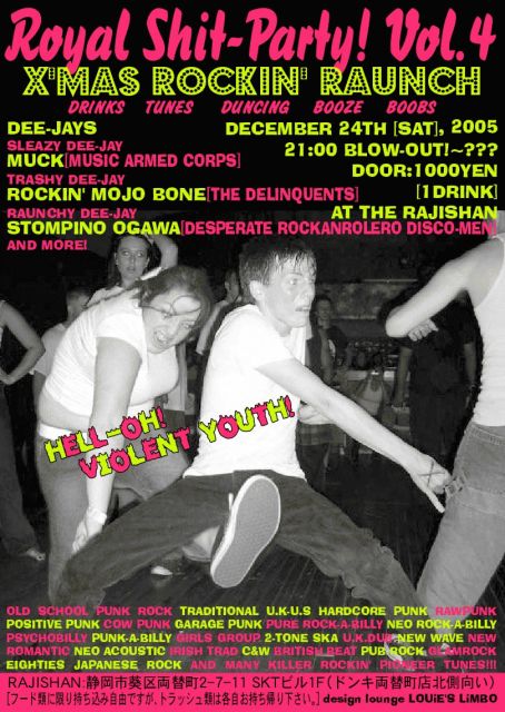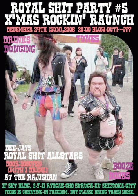 「ROYAL SHIT PARTY! #5 X'MAS ROCKIN' RAUNCH」 DRINKS! TUNES! DUNCING! BOOZE! BOOBS! ■DECEMBER 24TH [SUN] ,2006 ■20:00 BLOW-OUT!〜??? ■DOOR:1000YEN [with 1 DRINK] ■AT THE RAJISHAN ■1F SKT BLDG. 2-7-11 RYOGAE-CHO SURUGA-KU SIZUOKA-CITY (ドンキ両替町店北側向い) [DEE-JAYS] ROYAL SHIT ALLSTARS リンダ(THEJEZEBELS,ex-440'S,mixi-PUSSY LOVER) 芸者プッシー(BILLY-BOB CRAMPED,mixi-.:*芸者プッシー*:.) リタ(気まぐれキャッツ,mixi-リタ) ルーシー(気まぐれキャッツ,mixi-チホ) ルル