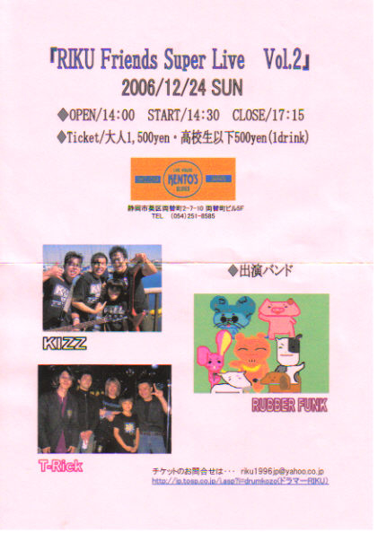 クリスマス・イブの昼間、リクちゃんの ライブ・パフォーマンスをたっぷり堪能しましょう。 デートの前にどうぞ。 Open 14:00 Start 14:30 Close 17:15 Fee 大人 \1,500- 高校生以下 \500-