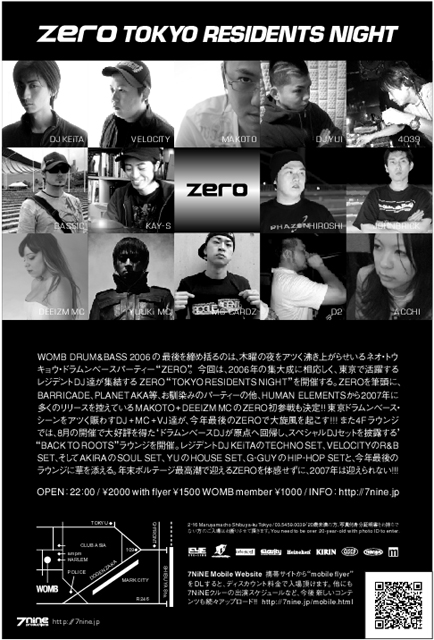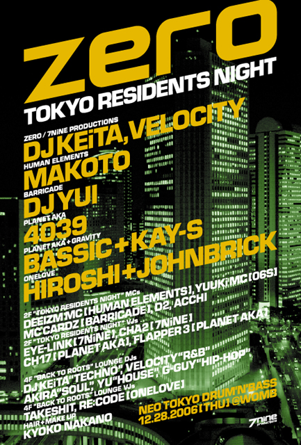 DJs: DJ KEiTA(ZERO/7NiNE) VELOCITY(ZERO/7NiNE) MAKOTO(HUMAN ELEMENTS) DJ YUI(BARRICADE) 4039(PLANET AKA) BASSIC(PLANET AKA) + KAY-S(GRAVITY) HIROSHI(ONELOVE) + JOHNBRICK(ONELOVE) MCs: DEEIZM MC(HUMAN ELEMENTS) YUUKi MC(06S/dlp) MC CARDZ(BARRICADE) D2 ACCHI VJs: EYE-LINK(ZERO/7NiNE) CHA2(ZERO/7NiNE) CH17(PLANET AKA) FLAPPER 3 (PLANET AKA) 4F "BACK TO ROOTS" DJs: DJ KEiTA "TECHNO" VELOCITY "R&B" AKIRA "SOUL" YU "HOUSE" G-GUY "HIP HOP" 4F "BACK TO ROOTS" VJs: TAKESHIT RE:CODE