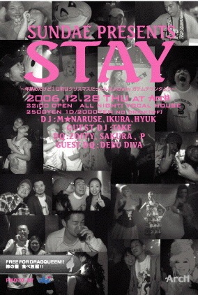 SUNDAE PRESENT ☆STAY ☆ VOCAL HOUSE& GAY MIX 2006.12.28 木 @ArcH (ex.ACE) http://clubarch.net/ open 2200 close 朝まで at door 2.500 1drink with Flyer 2.000 no drink DJs:M☆NARUSE, HYUK,IKURA GUEST DJ :TAKE DQ :ZOFFY,SAKURA,P GUEST DQ :DEBU DIVA 毎月最終木曜日に開かれているボーカルハウスを中心としたGAYMIXパーティー「STAY」がお届けするもの。それは、お客さん、出演者、スタッフ皆で笑えたりする事♪ 今年最後の「STAY」と言う事で、何を思ったか、とん