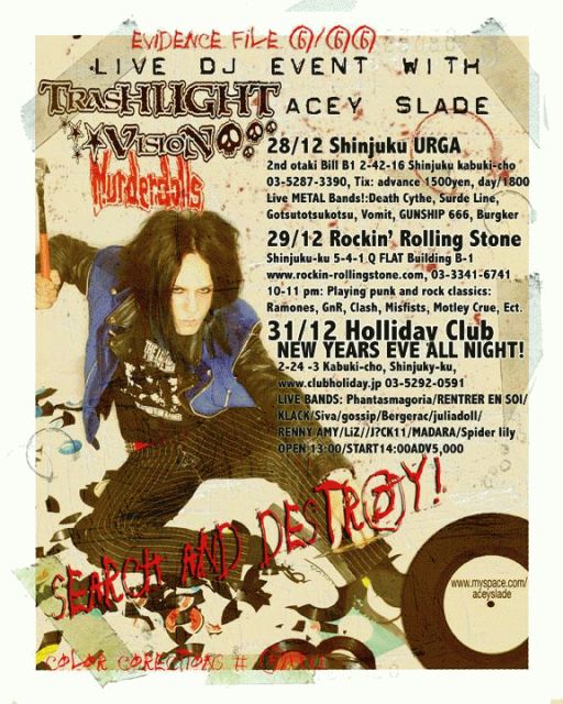 日本から世界へ、2007年夏に全米25都市30公演も大決定した日本最強のへヴィーメタルバンドGUNSHIP666の今年最後のライブに、MURDERDOLLS、dopeのギタリストであり現在は自身のバンドTRASHLIGHT VISIONで活躍中のAcey Slade氏が、GUEST DJとして参加することが大決定致しました!!! ライブはありませんが、Acey SladeのDJ PLAYを見られる貴重な時間。 PUNK、ROCKをルーツとしているAcey氏がどのようなDJをしてくれるのか必見です!そして盛り上がること間違いなし! この機会にDJ Acey Sladeと共にGUNSHIP666のライブも是非楽しんで下