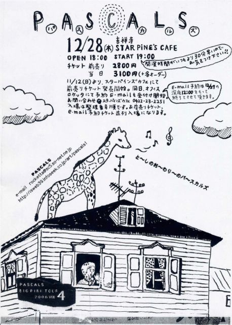 今年最後のライブです。 『 PASCALS Big Pink Tour 2006.vol.4』 12/28(木) 吉祥寺 STAR PINE'S CAFE 開場18:00 開演19:00 チケット:前売り¥2,800円 / 当日¥3,100円 (+各オーダー) 前売りチケットは11/12(日)よりスターパインズカフェにて発売開始です。 同日オフィスロケッタにて e-mail 予約も開始致します。 e-mail 予約は前日12/27の深夜12時を締めきりとさせていただきます。 入場は整理番号順です。お店売りのチケット、e-mail 予約チケット並列入場になります。 htt