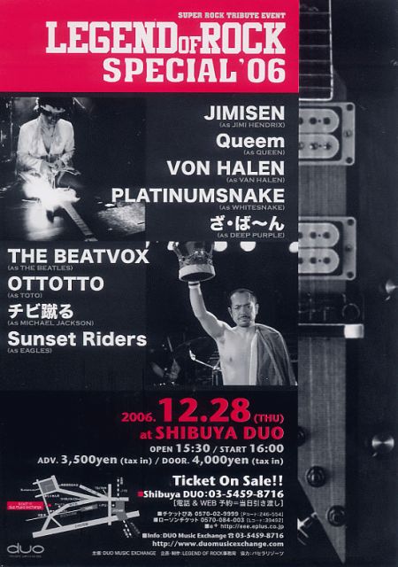 ■日時: 2006年12月28日木曜 OPEN 15:30 / START 16:00 ■会場: 渋谷duo music exchange 東京都渋谷区道玄坂2-14-8 03-5459-8716 http://www.duomusicexchange.com/ ■料金:前売¥3,500- / 当日¥4,000- ※ドリンク別 ■出演者&タイムテーブル: ・16時ごろ〜 OTTOTTO (as TOTO, BozScaggs) THE BEATVOX (as THE BEATLES) Sunset Riders (as EAGLES) ・18時ごろ〜 チビ蹴る w/ OTTOTTO (as MICHAEL JACKSON) ・19時ごろ〜 VON HALEN (as VAN HALEN) JIMISEN (as JIMI HENDRIX) ・20時半ごろ〜 ざ・ば〜ん (as DEEP