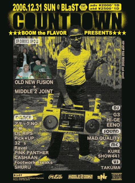 2006年も数々の地元アーティストによるnicepartyそしてbigguestを招いてのbigpartyをお届けしたclub@BlaST2006年の締めくくりは,昨年に引き続きDANCEというフィルターを通して音楽の楽しさを追求し続け自らが放つpositiveかつpeaceなvibesを常に提供しつづけてきたKARUakaav-kが放つ[BOOM THE FLAVOR VOL.4 with COUNT DOWN]です!DJ,DANCE,MC,VJ全てのclubカルチャーを融合した空間で、音楽という軸の基に集う仲間が最高の音楽とパフォーマンスにRESPECTを贈り最高の笑顔で酒を酌み交わすそんな2007年を共にスタートさせましょう!