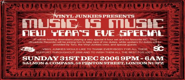 To celebrate the year we will be hosting a New Years Eve Special @ The Salmon and Compass. JP will be hosting downstairs playing a very special 9 hour set and his favourite MC, TRoy (Broadcite Records) will be joining him to take care of mic duties (watch out for the special midnight countdown). While upstairs DJ duties will be provided by Toru, the Vinyl Junkies crew and special gues