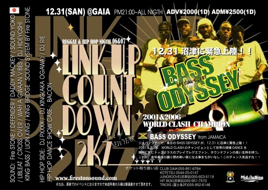 SPECIAL GUEST SOUND:BASS ODYSSEY(FR.JAMAICA. NY WORLD CLASH CHAMPIONS 2001&2006) SOUND:Fire STONE/DEFENDER/DADDY MACKEY/SOUND YOKO/LIBLEAT/CROSS OVER/WAH A GWAAN VIBES/DJ HIDEYOSHI/KING BASS/LION KING/KING BRIDGE.SOUND SYSTEM BY Fire STONE.HIP HOP SIDE:DJ PXXXX/DJ KING(AKA OGAWA)/DJ RIE.HIP HOP DANCE SHOW CASE :BACON(yohei and crew)