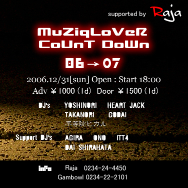 今年のRajaの大晦日はカウントダウンPARTY♪ いつものMuZiq LoVeRの4人に加え、今回は強力な助っ人がサポート!!更に時間拡大でいつも以上に盛り上がりは必至です。是非、皆さんでHAPPYな2007年を迎えましょう♪♪♪お気軽に遊びに来てくださいね〜★ ★☆Muziq LoVeR 06→07 COUNTDOWN ☆★ ■2006.12.31[SUN]@ Raja[SAKATA] ■START:OPEN 18:00 CLOSE:4:00 ■ADV \1000(1d)DOOR \1500(1d) ■DJ's YOSHINORI HEART JACK TAKANORI GODAI 平等院ヒカル ■Support DJ's ONO AKIRA S