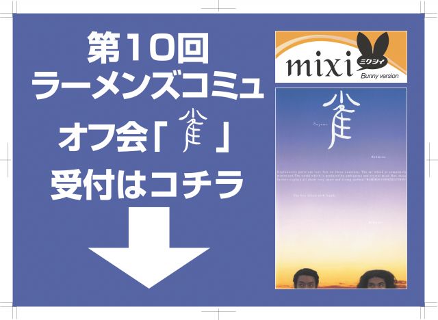 どもども。ダメダメ幹事のけーりん3号でございます。 さて、2005年 1月〜4月に行われた第15回公演「ALICE」から約2年、 いよいよ2007年2月1日から待望の第16回公演「TEXT」が行われます! そして、2005年1月30日に第一回が行われた当オフ会も2007年で二周年を迎えます! なので、今回は『祝「TEXT」初日直前&ラーオフ二周年記念』と題しまして、 第10回ラーメンズ・コミュオフ会「雀」@東京 の開催を告知させていただきます。 幸運にも「TEXT」のチケットを手に入れることができた方も 不幸にも「TEXT」のチケットが手に入れられなか