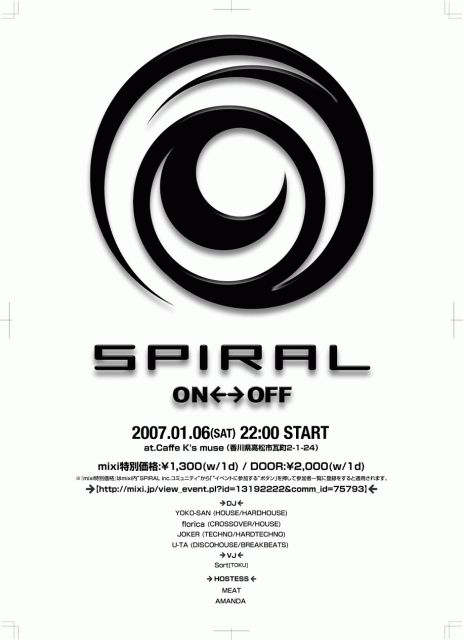 ■K's Final Countdown 05 『ON⇔OFF[onofu]』−SPIRALコミュ300人達成記念イベント− 2007.01.06(SAT) 22:00 START at.Caffe K's muse(香川県高松市瓦町2-1-24) mixi特別価格:\1,300(w/1d) / DOOR:\2,000(w/1d) ※『mixi特別価格』はこのトピ上の「“イベントに参加する”ボタン」を押して参加者一覧に登録をすると適用されます。 ☆DJ YOKO-SAN (HOUSE/HARDHOUSE) florica (CROSSOVER/HOUSE) JOKER (TECHNO/HARDTECHNO) U-TA (DISCOHOUSE/BREAKBEATS) ☆VJ Sort[TOKU] ☆HOSTESS MEAT AMANDA
