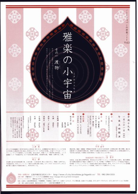 雅楽の演奏者と共演します。 私のオリジナル曲も2曲、演奏の予定です。 -------------------------------------------------------- 雅楽の小宇宙(ミクロコスモス) その一 渡物(わたしもの) 日時 平成十九年 一月二十一日(日) 午後五時開演(四時半より受付) 会場 広島市東区民文化センター スタジオ1 出演 三浦 進(篳篥) 平井 由宇(横笛) 村上 律(笙) RAKASU PROJECT.(コンピュータ、作編曲) 参加費 事前予約 1500円 当日参加 1800円 曲目 越天楽三調 平調