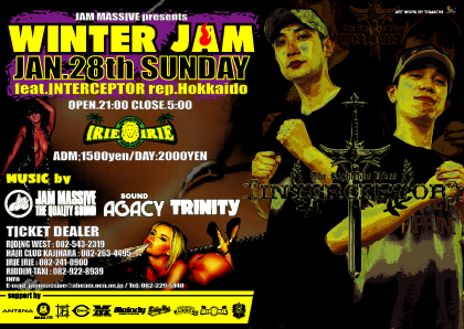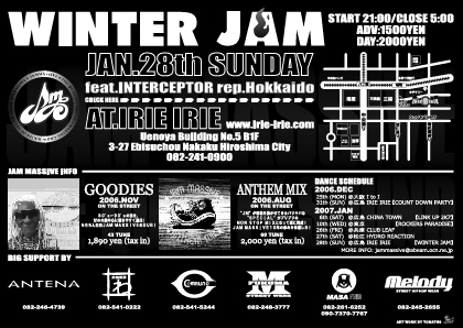 WINTER JAM 日時 1月28日(日曜)OPEN 21:00〜 場所 CLUB IRIE IRIE 082-241-0900 広島市中区胡町3−27 第5ウエノヤビル B1F 出演 INTERCEPTOR from 北海道 JAM MASSIVE SOUND AGACY TRINITY チケット 前売 ¥1500 当日 ¥2000 チケット取扱店 CLUB IRIE IRIE 082-241-0900 HAIR CLUB KAJIHARA 082-263-4495 RIDING WEST 082-543-2319 RIDDIM TAXI 082-922-8939 MORE INFO 082-229-5140 ※毎月恒例のダンス"IRIE SUNDAY" 今回はJAM MASSIVE 企画による スペシ