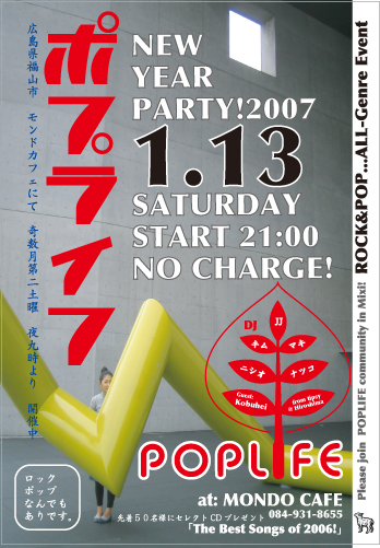おかげさまで、前回11/11の1周年記念は大盛況となったPOPLIFE。 2007年も楽しく、騒がしくやっていきますので、よろしくお願いします。 次回POPLIFEは、新年早々、1/13(土)モンドカフェにて 「NEW YEAR PARTY」と題して開催します! ポップでロックな音楽とお酒とともに、 2007年の「騒ぎ初め」をしに、遊びにきてください。 もちろん、ノーチャージ、入場無料です。 先着50名様には、POPLIFE MIX CDをプレゼントします。 今回のテーマは、「The BEST Songs of 2006」。 POPLIFE的に2006年を振り返った内容となっています。 ゲットした