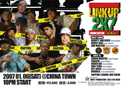 新年明けましておめでとうございます! 今年もよろしくお願いします。 いろんな企画でみんなを楽しませたいと思ってるのでお楽しみに! 今年もサポートよろしく!!! IRIE IRIEは3日からです! そして6日は新年1発目のダンス UNITY PRO PRESENTS LINK UP 2K7 2007.1.6(土) 21:00〜 @CHINA TOWN(広島) 料金 前売り\2500 当日\3000 ・guest artist: JUMBO MAATCH. TAKAFIN. BOXER KID. JING-TENG. KEY-ROCK. DRIBBLA ・guest sound: MIGHTY JAM ROCK. JAM MASSIVE. BURST RISE ・support sound: IRIE CREW sound system by