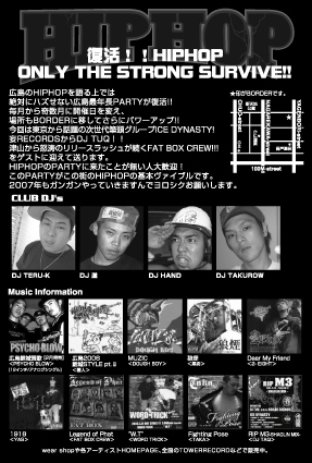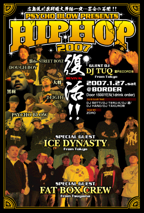 “psycho blow presents HIPHOP" 広島が誇る最高で最古なPSYCHOのPARTY“HIPHOP"がついに復活!! 場所もBORDERに変えてさらにPOWER UP!! 広島のHIPHOPの王道しかと体感してください。 FUCK BABYLON!! 復活第一弾ゲストは 話題騒然次世代筆頭GROUP ICE DYNASTY(TOKYO)!!! ○妄RECORDSからDJ TUQ(TOKYO)!!! 怒涛のリリースが続く FATBOXCREW(TUYAMA)!!!! 豪華広島SIDE PSYCHO BLOW(HIROSHIMA) 黒羽(HIROSHIMA) DOUGH-BOY(HIROSHIMA) 2-EIGHT(HIROSHIMA) 韻theSTREET BOYZ(HIROSHIMA)