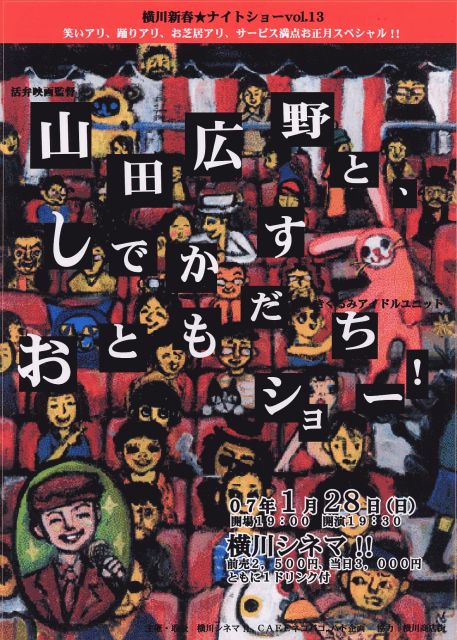 安部泰輔さんデザインのきぐるみ達が 小芝居に踊りにと大暴れ! 横川新春★ナイトショーvol.13 【山田広野と、しでかすおともだちショー!】 おかしなイキモノ達とキュートボイスのハレンチ活弁が大暴れ!!! 笑いアリ、踊りアリ、お芝居アリ、サービス満点お正月スペシャルナイトショー 2006年師走、東京の下町に現れた巨大なぬいぐるみ達。愛らしく無気味な容貌。つぶらな瞳の奥に秘める狂気とエロス…。多分猫のタブネイキャット、兎かな?のウーシャカラビット、きっと羊のキットヒシープ、恐らくはとのオシュハピジョンの4匹と