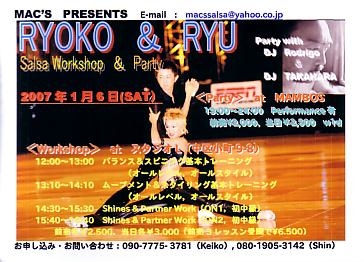 〜MAC'S PRESENTS〜 ♡゚+.♥゚+.♡ RYOKO&RYU Workshop&Party ♡゚+.♥゚+.♡ 日時 2007年1月6日(土曜日) ◆Workshop at スタジオL(中区小町9-8) ・12:00〜13:00 バランス&スピニング基本トレーニング (オールレベル,オールスタイル) ・13:10〜14:10 ムーブメント&スタイリング基本トレーニング (オールレベル,オールスタイル) ・14:30〜15:30 Shines&Partner Work(O