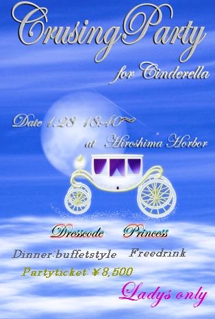 はじめまして。 女性だけのクルージングパーティーを1月28日広島の宇品港出航で行います。 新しくお友達を作って友達の輪をひろげようがコンセプトのパーティーです! みんなで楽しめるゲームなどをたくさん企画しておりますので1人でのご参加でも楽しめますし、 お友達を誘ってのご参加も大歓迎です!! (銀河という船の1階を貸しきって行います) 時間 18時50分出航(15分前には乗船をお願いいたします) 21時宇品港解散 宮島・海田大橋のライトアップを船から見れます! 乗船代・ディナー・フリード