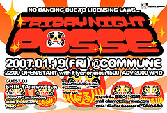 http://sunloop.com/archives/2007/01/119friday_night.php あけましておめでとうございます。 本年も変わらぬご愛顧を。 ということで、今年1発目はお年玉ということで、 0:00までにお越しの女性に限りエントランスフリー(1オーダー) とさせていただきます。 キャッシャーにて「mixiで見た!」とご申告ください。スタッフ全員で待ちしております。 2007-1-19 22:00:00 『Friday Night Posse』@COMMUNE [MAP] with flyer or mixi: \1,500 W/1D DOOR: \2,000 W/1D <GUEST DJ> SHIN-YA(NEW WORLD) <DJ > okamOTO(ex.SUN